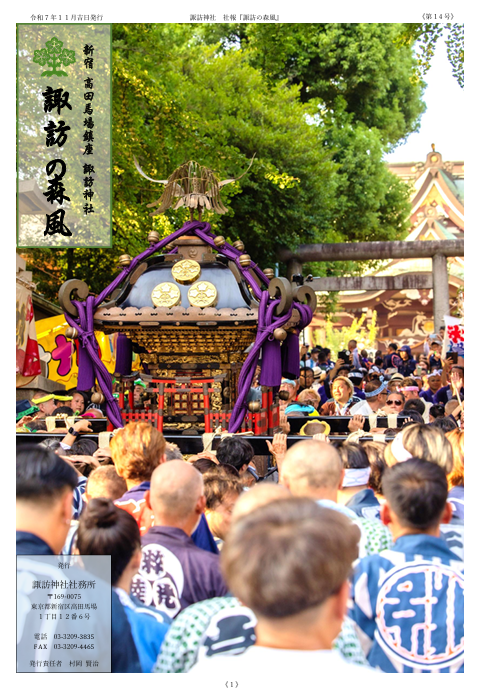 2025.11.09 氏子崇敬者の皆さまへ 社報『諏訪の森風』をお送りしました 11月初めに、年に1度の社報『諏訪の森風』を、 氏子崇敬者の皆さまにお送り致しました。 住所変更、もしくは届いていない方、 また新たにご希望の方は、お問い合わせください。